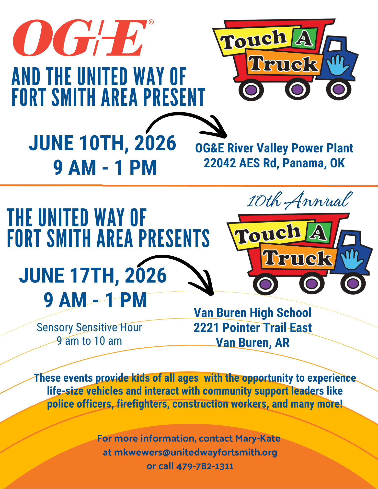 The United Way of Fort Smith Area is excited to host its Annual Touch-A-Truck on June 10 at the OG&E River Valley Power Plant, located at 22042 AES Rd in Panama, OK, and on June 17th at Van Buren High School, located at 2001 E Pointer Trail in Van Buren, AR.  This is our 3rd year partnering with OG&E in Panama and our 10th year at Van Buren High School in Van Buren. Touch A Truck is a fun, family-friendly event that brings our community together for a hands-on experience like no other.